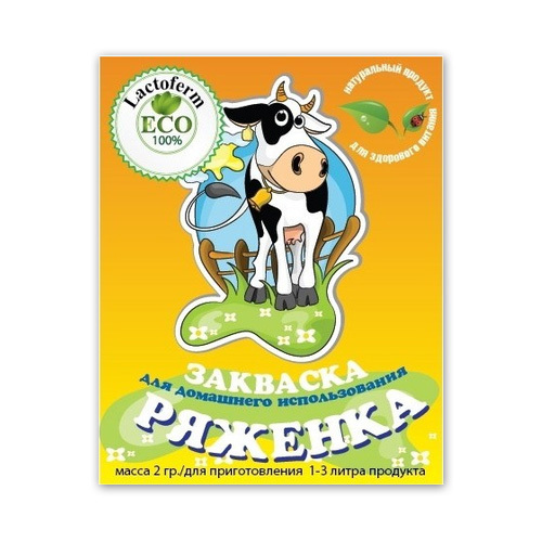 Кстати, превратить закваску для ряженки в полноценный напиток очень просто. От одного до трёх литров молока нужно довести до температуры 38-40оС. В тёплое молоко вводится пакет нашей закваски ряженка лактоферм эко, после чего нужно тщательно перемешать их друг с другом. Далее смесь нужно влить в йогуртницу, мультиварку или термос (хотя может подойти и обычная кастрюля) и оставить на 8-10 часов, главное условия недавать остыть молоку или перегркться. По завершению этого срока дайте почти готовому напитку (ряженке) охладиться пару-тройку часов. Готово! При помощи нашей закваски для ряженки(Lactoferm ECO) вы самостоятельно превратили обычное топленое молоко во вкуснейший напиток с необычайными лечебными свойствами.